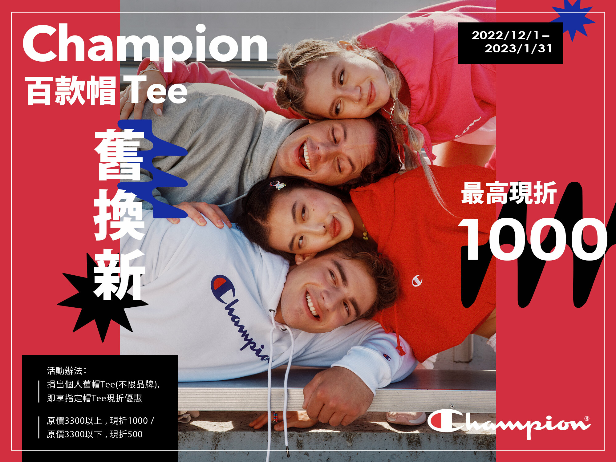 活動辦法:於實體店點的活動看板前拍照並私訊Champion Taiwan FB&IG,經認證即享指定帽Tee現折優惠