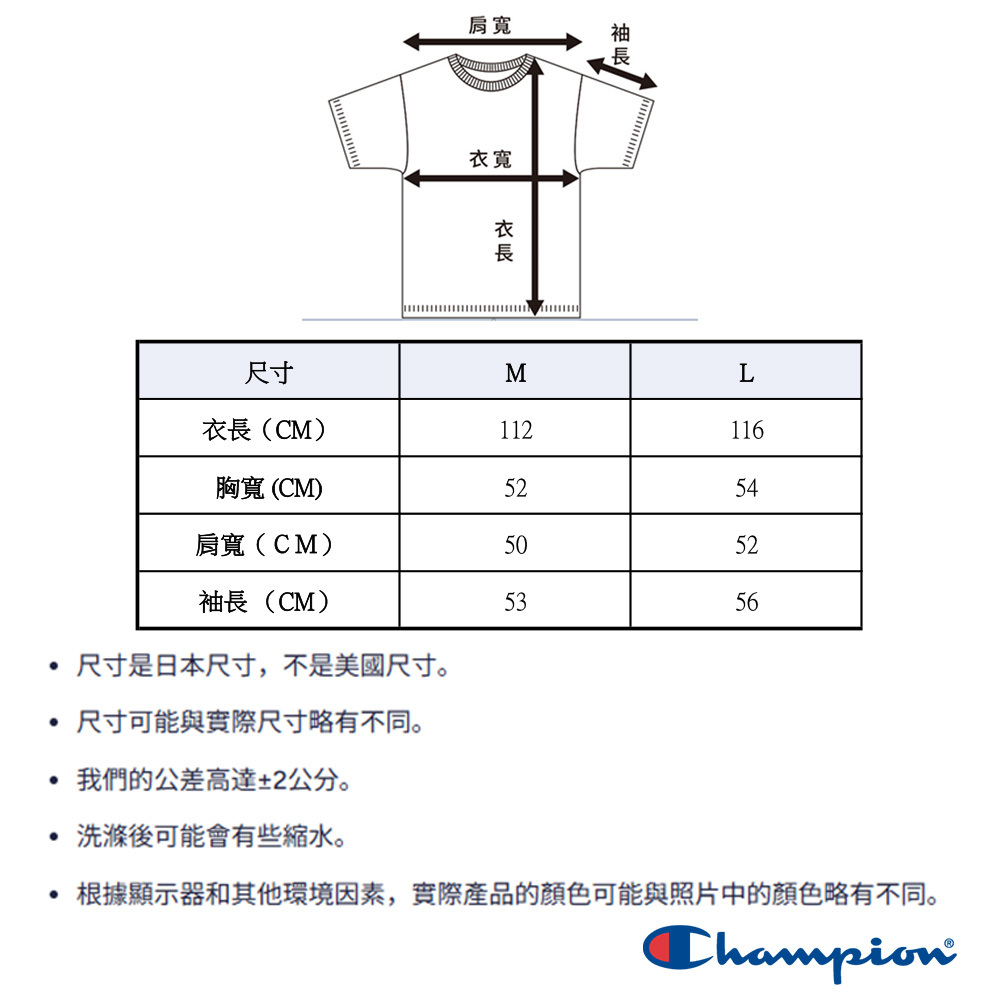 寬鬆的版型,寬鬆的版型。左胸處繡有細體「CHAMPION」標誌,C 字標誌的顏色會根據身體顏色而改變。