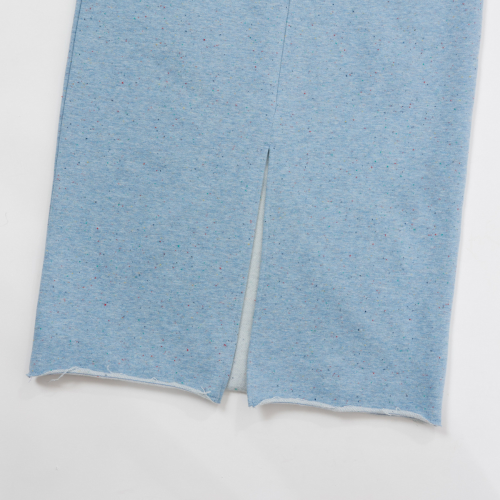 從腰部到下擺,輪廓簡潔俐落,下擺略帶毛邊。