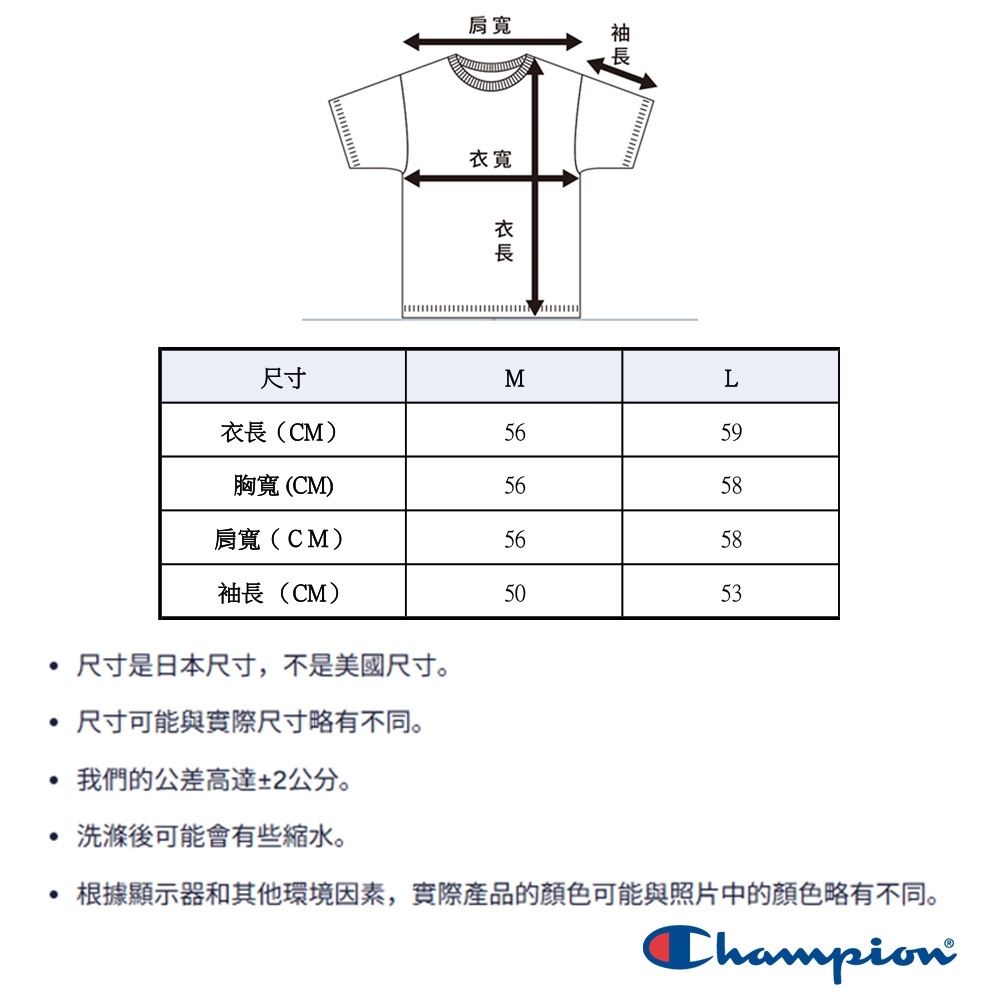 左胸處繡有細體「CHAMPION」標誌,C 標誌的顏色會根據衣身顏色而改變。