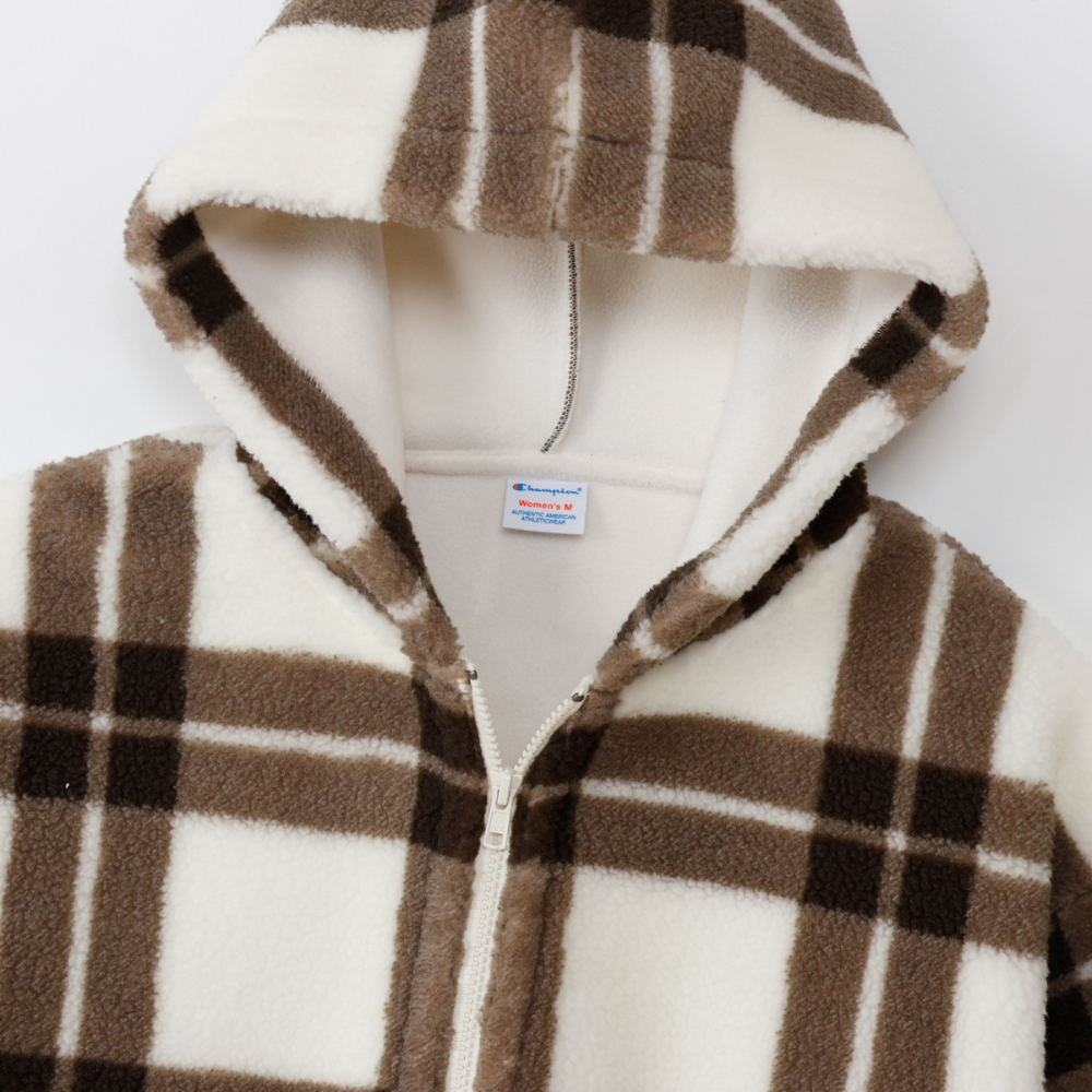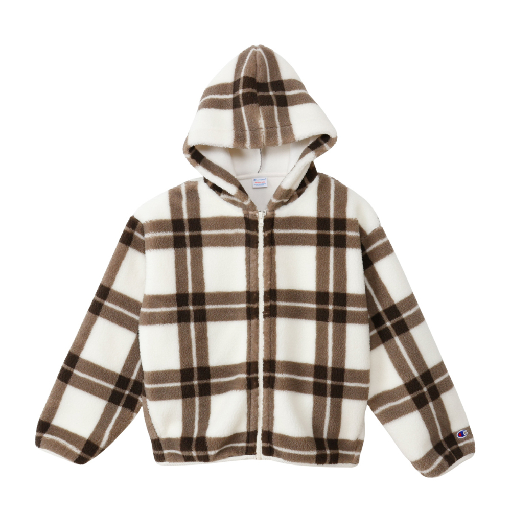 這款拉鍊連帽外套採用100%聚酯抓絨布料,飾有格紋印花,前後身觸感柔軟。