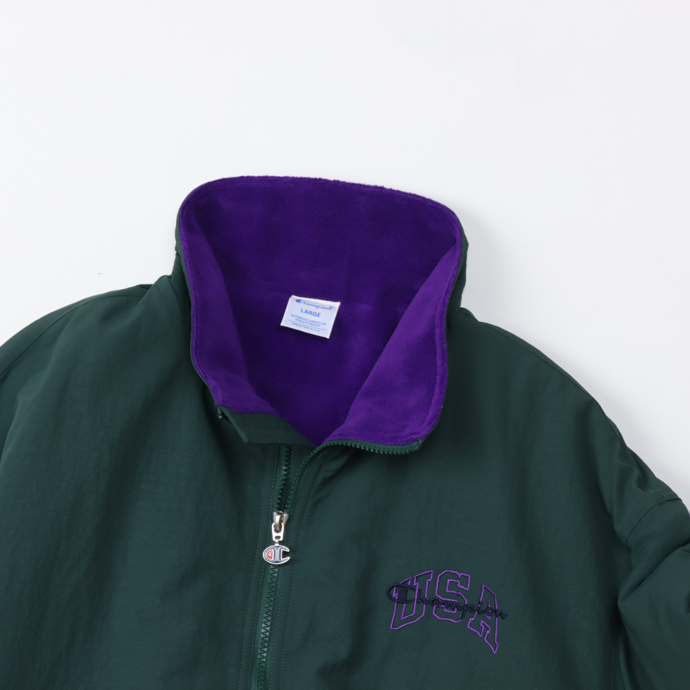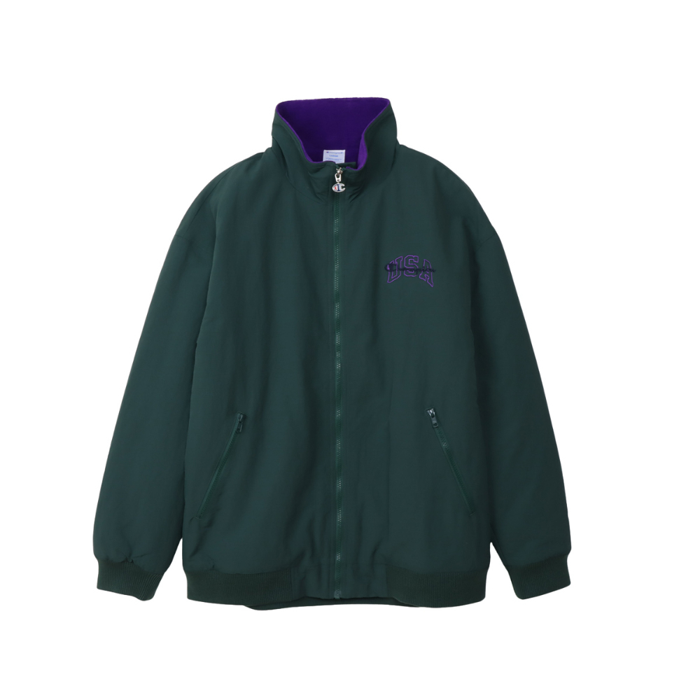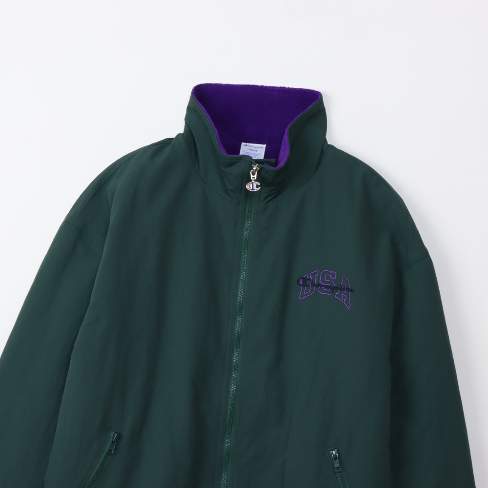 這款拉鍊外套採用霧面皺褶尼龍布料,內襯高密度厚實抓絨,保暖性極佳,袖口則配有襯墊。