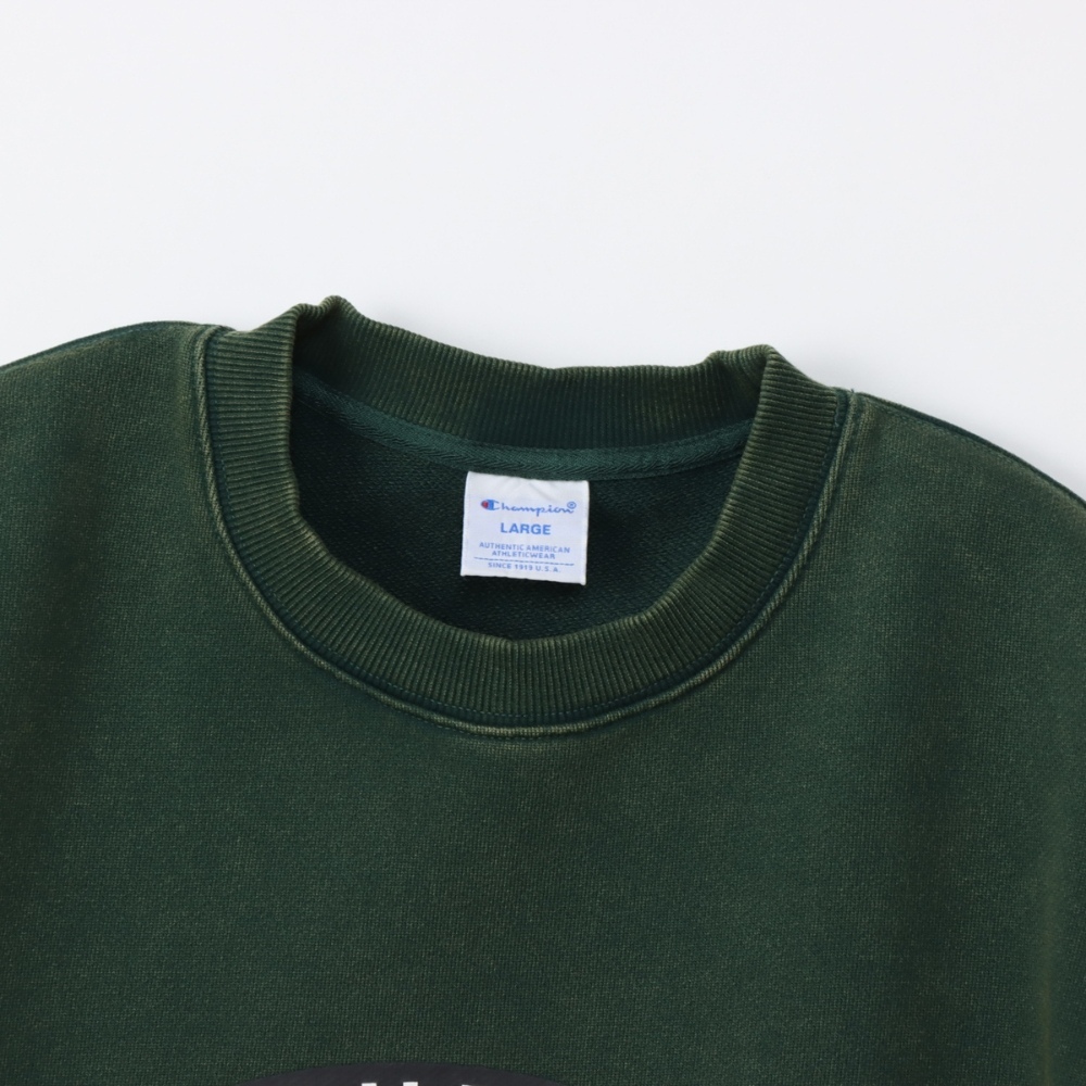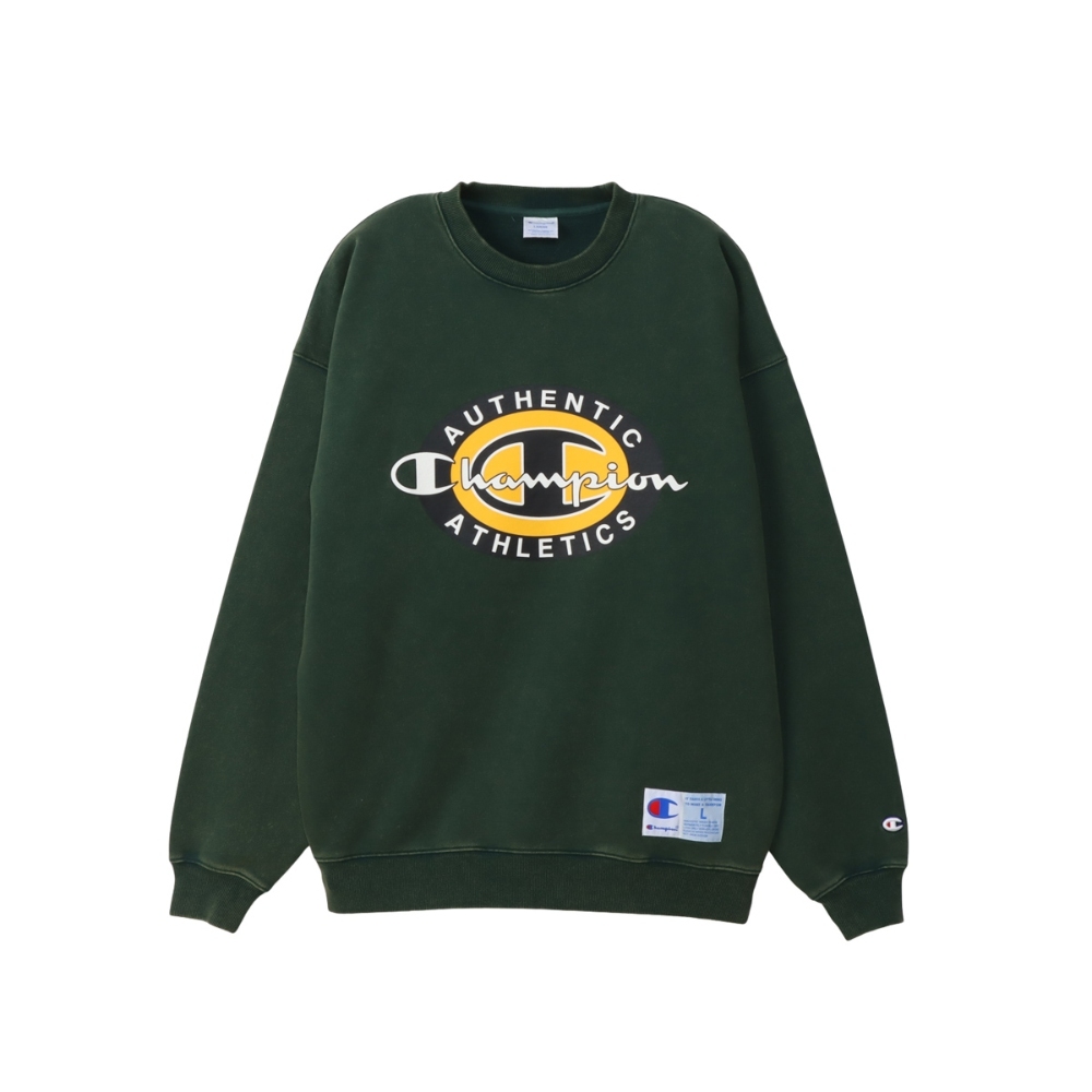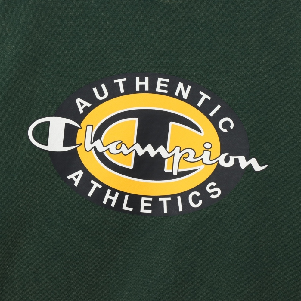 胸前印有橡膠印花橢圓形圖案,融合了 C 字標誌、Champion® 標誌和“AUTHENTIC ATHLETICS”字樣。