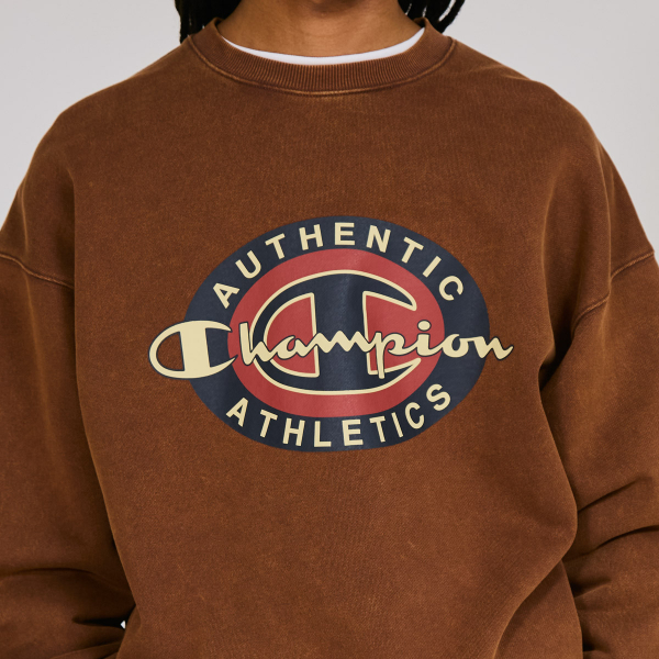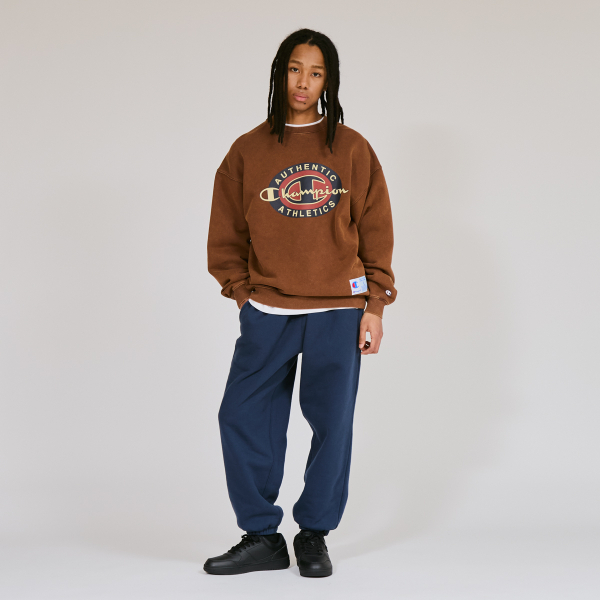 胸前印有橡膠印花橢圓形圖案,融合了 C 字標誌、Champion® 標誌和“AUTHENTIC ATHLETICS”字樣。