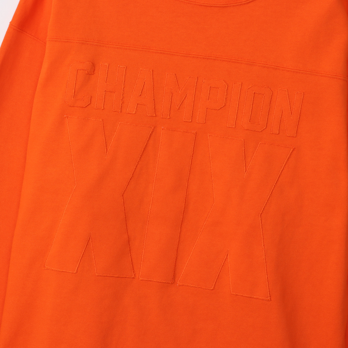 T卹經過預洗處理,帶來舒適做舊感,並飾有與主體相同材質的貼花,包括羅馬數字「XIX」和代表Champion®成立年份1919的「CHAMPION」。