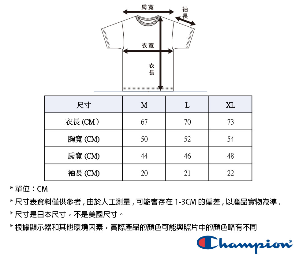 * 左胸印有「CHAMPION ATHLETICS」字樣,背面則印有大寫字母「C」和Champion標誌的圖案。